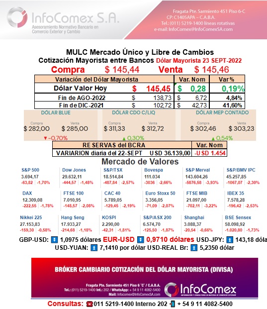 - Dólar Mayorista: USD 140.311,00 compra el BCRA a $ 200,00. Operado USD 59,50 millones de volumen genuino, en 2 horas de mercado.