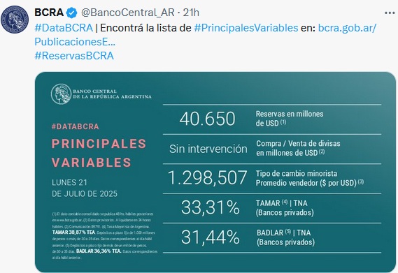 USD 40.650 millones📈Hoy, sube USD 263 millones las RESERVAS en el BCRA al 22-JUL: Sin intervención