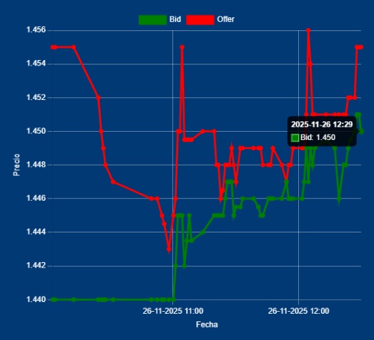 📌📈12,30 Hs Cotización del MULC entre Bancos – Dólar Divisa Bid 1450,00 – Offer 1455,00 Mantiene la tendencia, compradora. Donde vemos que hay IMPO que se están adelantando por el Feriado de mañana en🇺🇸. Hay muy poca EXPO, y recién entraría para fin de Dic, la cosecha fina de🌾trigo. Los primeros valores, en la apertura. Techo superior $1.508,98 debería vender el BCRA