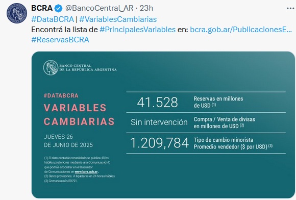 📌 USD 41.423 millones📈Hoy, sube USD 105 millones las RESERVAS en el BCRA al 26-JUN🤔: Sin intervención