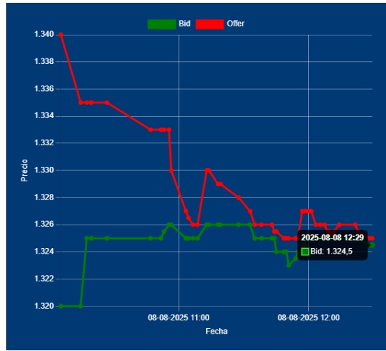 📌12,30 Hs Cotización del Dólar Divisa: Bid 1324,00 Offer 1325,00 cotización entre Bancos. Está el BCRA, monitoreando el MULC. Indicador, que no hay mucha EXPO, y por ende estimamos que no es mal momento de Pagar IMPO. Seguimos sosteniendo un rango para hoy, entre 1320 y 1335 Valores entre Bancos.