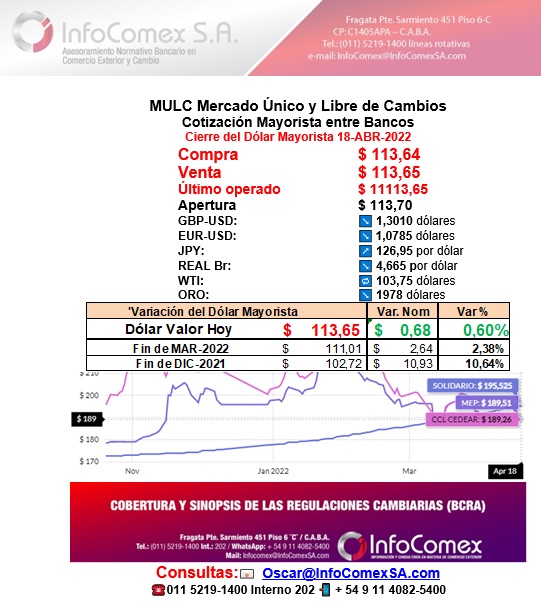 - Servicios de Asesoramiento Cambiario – Bróker Cambiario:: por experiencia en anteriores crisis, lamentablemente hay que estar atento, el piso de apertura del BCRA, dado estaría aceleando «las micro devaluaciones diarias». Nuestros análisis, debería convalidar una suba promedio de 20 centavos diarios para alcanzar la inflación. Por ende, cada día que no lo logre, mayor debería ser al momento del ajuste Más información en el siguiente enlace INGRESAR