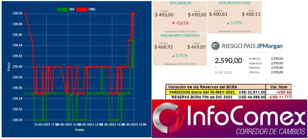 Mercado Mayorista de Cambios, hubo valores de apertura en 239,35/239,45 comprador y vendedor respectivamente. Se mantuvo gran parte de la jornada, pero sobre el final de la rueda, el dólar terminó vendedor en 239,50 Cierra MAYO con una suba de 7,55%, es decir subió $ 16,82 contra el cierre de ABRIL