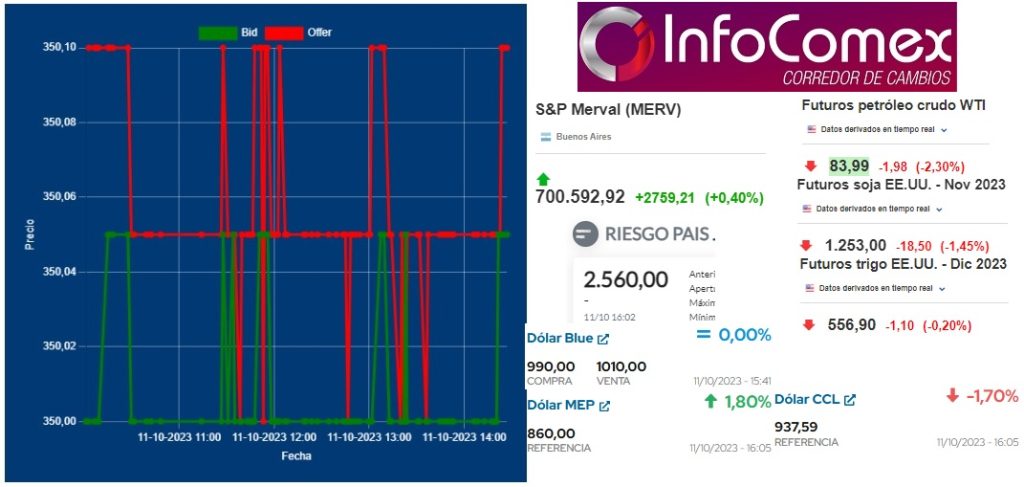 11-Oct MULC $ 350,00 Cierre Dólar Oficial. Merval – Dólares Financieros – Riesgo País – WTI – Soja – Trigo – Maíz