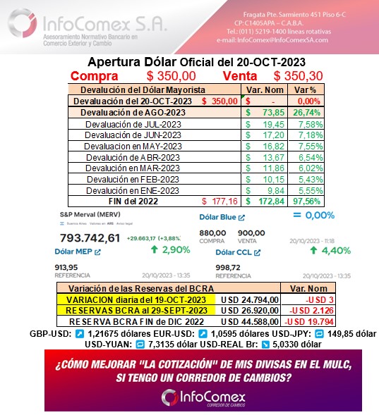 20-OCT: MULC: $ 350,00 / 350,30 Apertura Dólar Divisa, entre Bancos.