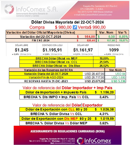 22-OCT-2024: MULC-Dólar Divisa, ↗️ entre Bancos 🤔 Dólares Financieros: expectantes por lo expresado por Milei