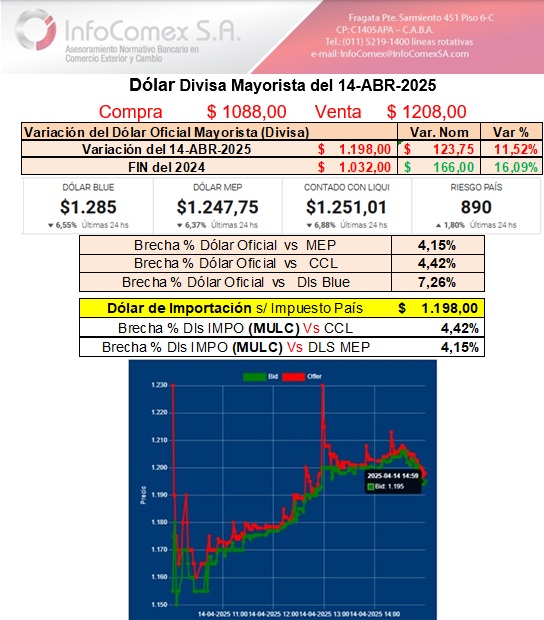 📌 15,00hs 14-ABR: MULC-Dólar Divisa 🤔Sube 12% Vs Cierre del Viernes. Compra$ 1190,00 – Venta $ 1210,00