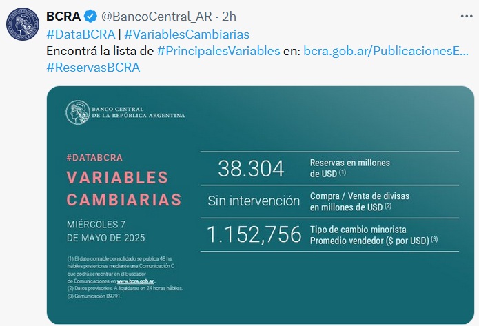 📌 RESERVAS en el BCRA al 07-MAY: Sin intervención. No compra, ni Vende