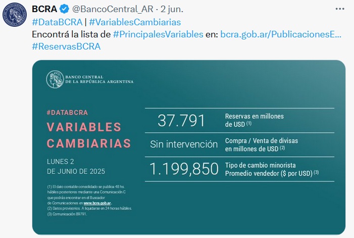 📌 USD 37.791 millones. 📈Subió USD 937 millones, las RESERVAS en el BCRA al 02-JUN🤔: Sin intervención.