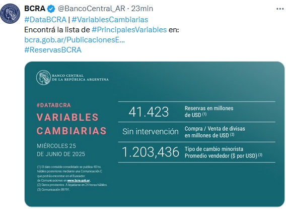 📌 USD 41.423 millones📈Hoy, sube USD 205 millones las RESERVAS en el BCRA al 25-JUN🤔: Sin intervención