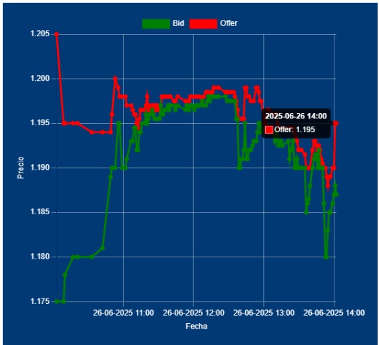📌 15,00hs📈Cierre del Dólar Divisa: 1188,00 – 1190,00 entre Bancos. Con alta volatilidad y con menos de la mitad del volumen de ayer, el BCRA pudo controlarlo.