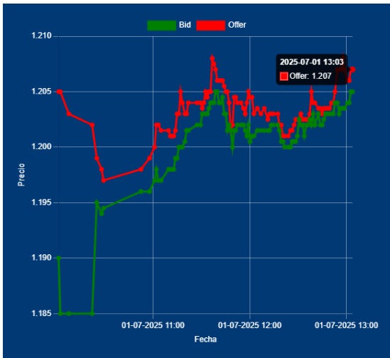 📌 13,00Hs📈Cotización del Dólar Divisa: 1205,00 – 1207,00 entre Bancos. Está consolidando la tendencia, pero con poco volumen, motivo por el cual podría generar una volatilidad inesperada.