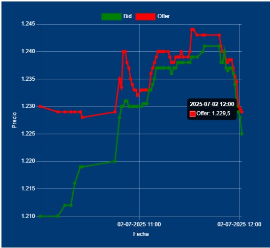 📌 13,00Hs📈Cotización del Dólar Divisa: 1231,00 – 1234,00 entre Bancos. Si bien hay un bajo volumen operado (USD 121 millones en C0MEX), aún la tenencia compradora.