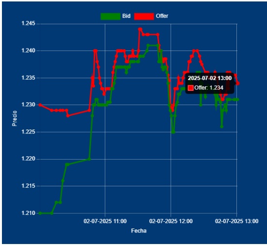 📌 13,00Hs📈Cotización del Dólar Divisa: 1231,00 – 1234,00 entre Bancos. Si bien hay un bajo volumen operado (USD 121 millones en C0MEX), aún la tenencia compradora.