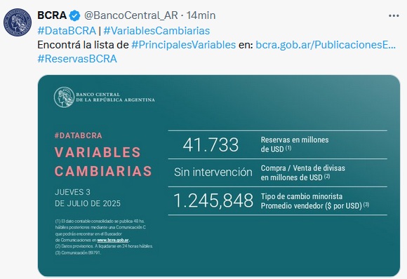 📌 USD 41.654 millones📈Hoy, sube USD 79 millones las RESERVAS en el BCRA al 03-JUL🤔: Sin intervención