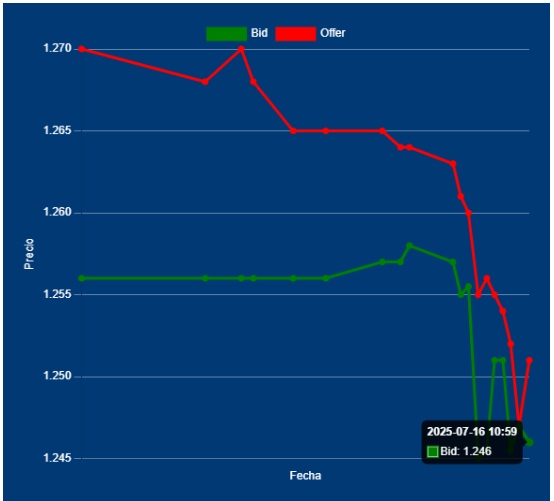 11,00Hs 📉↘️Apertura del Dólar Divisa: Bid 1246,00 Offer 1251,00 cotización entre Bancos. Vendedor. Ayer cayó por intervención del BCRA en Pases Pasivos llegando un rendimiento a 1 día del 30% promedio. El Tesoro, hoy Licitan Lecaps y Boncaps. Venden para ir a tasa.