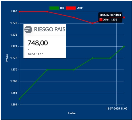 11,00 Hs Apertura del Dólar Divisa: Bid 1274,00 Offer 1279,00 cotización entre Bancos. Riesgo País, subió. Ayer la Tasa de Caución a 1 día fue de 26% al 35%. Empieza una puja de Tasa Vs. Dólar