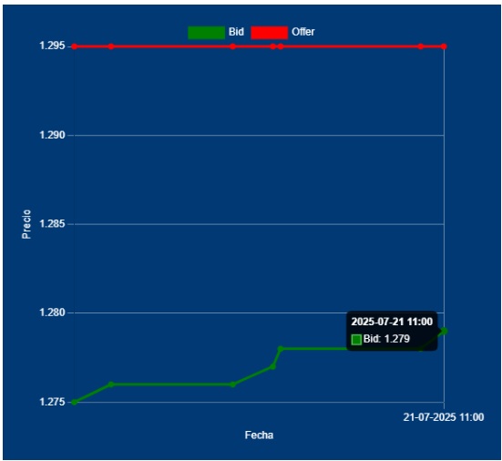 11,40Hs Cotización del Dólar Divisa: Bid 1292,00 Offer 1294,00 cotización entre Bancos. Sube, y se aproxima a 1300,00 forzando al BCRA a intervenir, que aún no lo detectamos, salvo que sea nuevamente el Tesoro (Caputo), comprando.