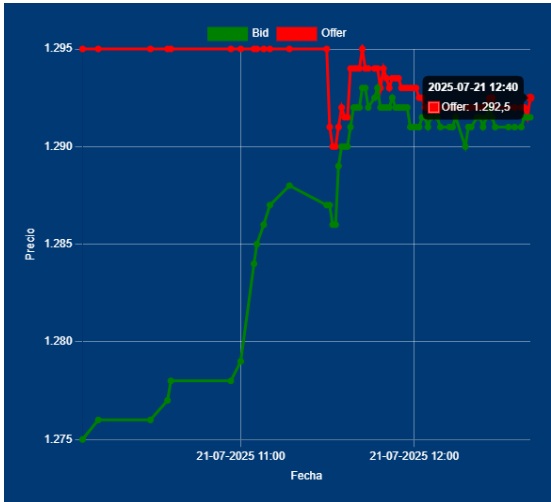 12,40Hs Cotización del Dólar Divisa: Bid 1291,50 Offer 1292,50 cotización entre Bancos. De fondo es comprador, y no detectamos EXPO como lo habitualmente suele aparecer a esta altura del MULC.