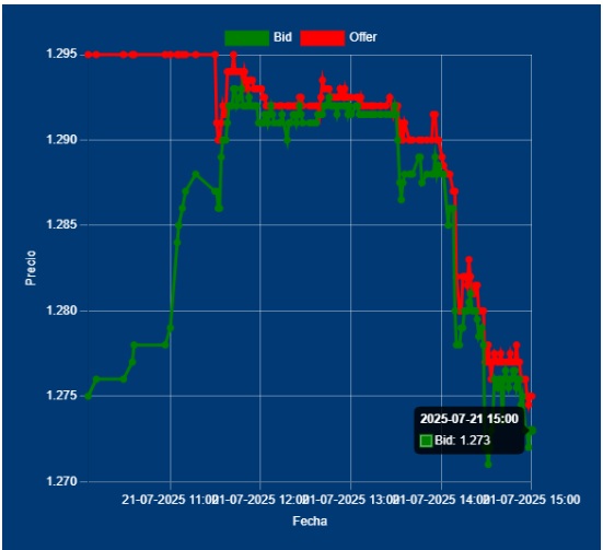 15,00hs 📉Cierre del Dólar Divisa: Bid 1273,00 Offer 1275,00 cotización entre Bancos. Sin volumen, cae $ 15,00 en la última hora, por la influencia del BCRA, en los futuros largos. A estos niveles, aprovecharía de cerrar IMPO