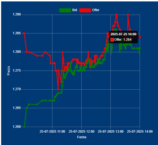 📌14,00 Hs Cotización del Dólar Divisa: Bid 1281,00 Offer 1284,00 cotización entre Bancos. Sube con volumen y con una Tasa interbancaria x 1 día 43%. 🤔Creo que no es mal momento, para adelantar Pagos de Impo.