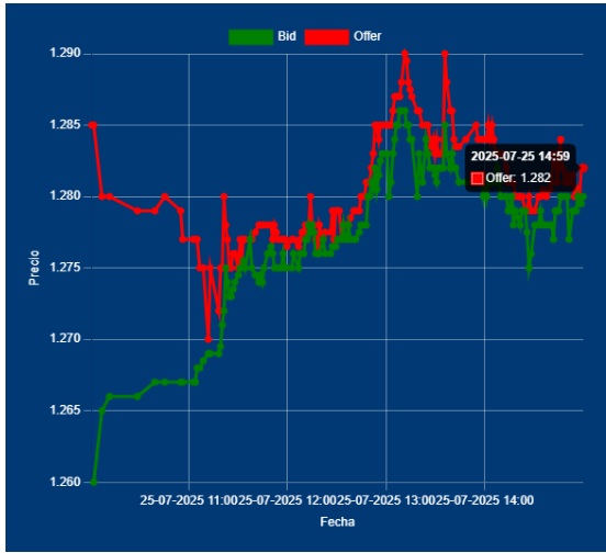 📌14,00 Hs Cotización del Dólar Divisa: Bid 1281,00 Offer 1284,00 cotización entre Bancos. Sube con volumen y con una Tasa interbancaria x 1 día 43%. 🤔Creo que no es mal momento, para adelantar Pagos de Impo.