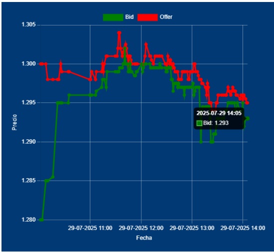 📌 14,00 Hs Cotización del Dólar Divisa: Bid 1293,00 Offer 1295,00 cotización entre Bancos. Contenido por el BCRA, pero sigue comprador. El mercado, está esperando el Decreto con la baja de retenciones. Creo que no es mal momento, para adelantar Pagos de Impo.