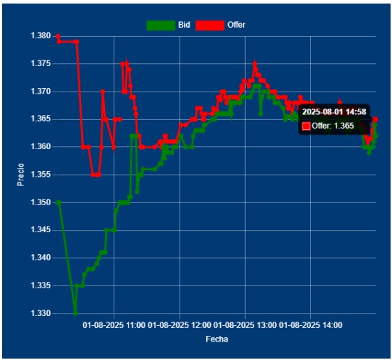 📌 14,00 Hs 📈Cotización del Dólar Divisa: Bid 1366,00 Offer 1367,00 cotización entre Bancos. Está la intervención indirecta del BCRA, para controlar el MULC