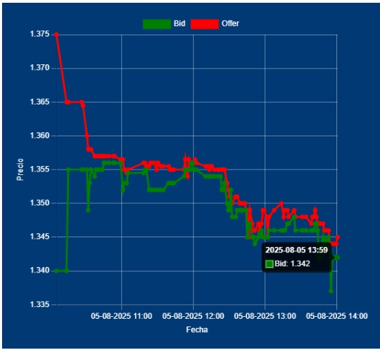 📌 14,00 Hs 📉Cotización del Dólar Divisa: Bid 1342,00 Offer 1345,00 cotización entre Bancos. Con un volumen representativo, hay Exportación que están adelantando, para aprovechar en colocar los $$ en rendimientos a Tasa. No es mal momento, de cerrar IMPO en la baja.