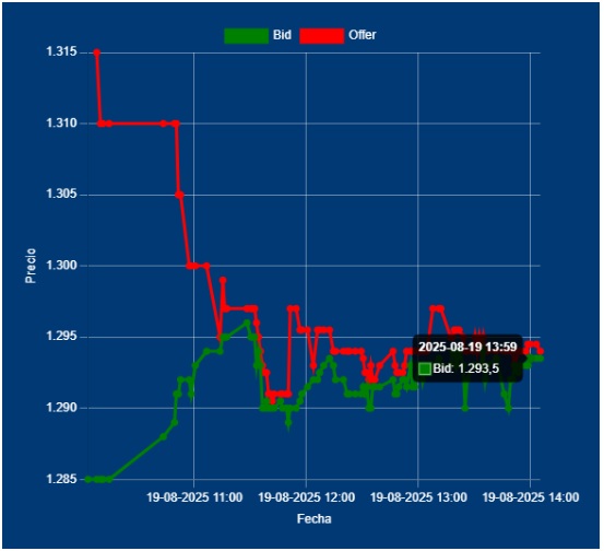 📌 14,00 Hs Cotización del Dólar Divisa: Bid 1293,00 Offer 1294,00 cotización entre Bancos. Mantiene este nivel, pero con un volumen relativamente bajo