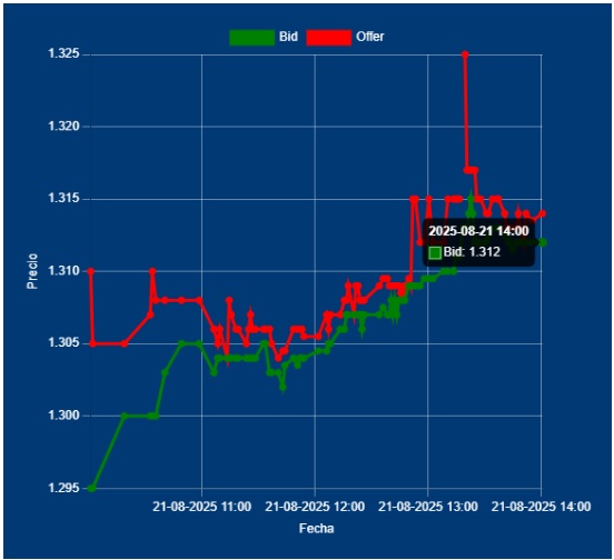 📌📈14,00 Hs Cotización del Dólar Divisa: Bid 1312,00 Offer 1315,00 cotización entre Bancos. Mantuvo la tendencia y consolida en $ 1300,00 en el MULC, sigue con por volumen genuino sin el BCRA