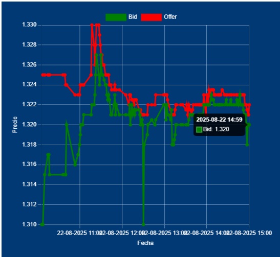 📌📈14,00 Hs Cotización del Dólar Divisa: Bid 1322,00 Offer 1323,00 cotización entre Bancos. Por ahora el BCRA, lo tiene controlado, seguimos notando poco presencia de la EXPO