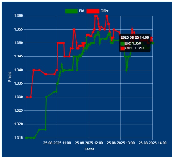 📌📈 14,00 Hs Cotización del Dólar Divisa: Bid 1350,00 Offer 1350,00 cotización entre Bancos. Está el BCRA monitoreando el MULC, por eso se ha frenado la suba. Estimamos, que de fondo sigue comprador.