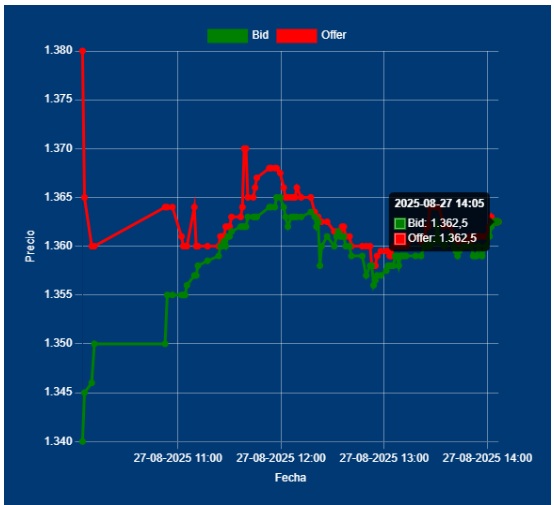 📌🔁14,00 Hs Cotización del Dólar Divisa: Bid 1362,00 Offer 1362,00 cotización entre Bancos. No ha cambiado la tendencia de fondo, es comprador. Fin de Dic, se opera a 1545,00 Representa casi un 14% en 120 días. Hay esperar, los resultados de la licitación del Tesoro