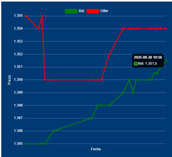 📌🔁11,00 Hs Apertura del Dólar Divisa: Bid 1351,00 Offer 1354,00 cotización entre Bancos. Inicia tendencia, a pesar de convalidar hasta el 76% (TNA) en la licitación del Tesoro. Equivale hasta el 6,2% mensual, que lleva al Riesgo País a los 850 pb, que no disipa el «peligro» de que siga escalando. La lógica indicaría que, por lo menos no debería subir el MULC.