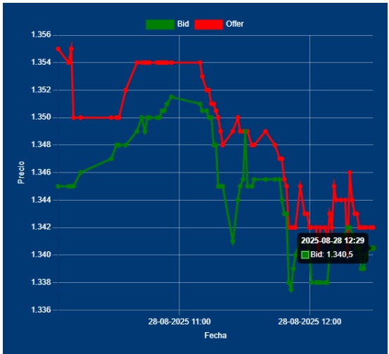 📌 📉12,30 Hs Cotización del Dólar Divisa: Bid 1340,00 Offer 1342,00 cotización entre Bancos. Baja sin volumen, con la presencia del monitoreo del BCRA. No detectamos a los AgroExportadores, ingresando para aprovechar las altas tasas que están pagando los Bancos.