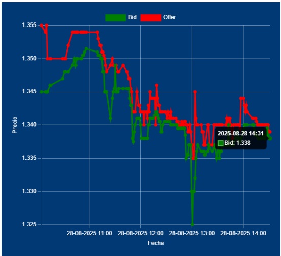 📌 📉12,30 Hs Cotización del Dólar Divisa: Bid 1340,00 Offer 1342,00 cotización entre Bancos. Baja sin volumen, con la presencia del monitoreo del BCRA. No detectamos a los AgroExportadores, ingresando para aprovechar las altas tasas que están pagando los Bancos.