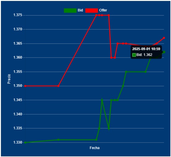 📌📈 12,30 Hs Cotización del Dólar Divisa: Bid 1371,00 Offer 1376,00 cotización entre Bancos. Importante presión compradora, donde la oferta es muy escasa, agravado por el feriado en EEUU Día del Trabajo en los EEUU.