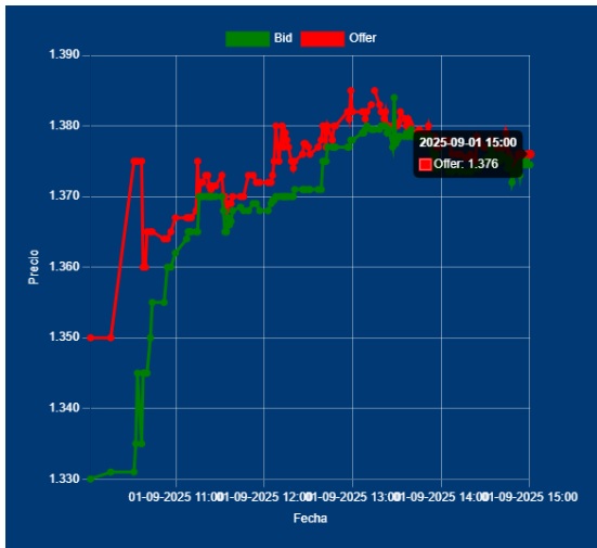 📌📈 15,00 Hs Cierre del Dólar Divisa: Bid 1374,00 Offer 1376,00 cotización entre Bancos. Con USD 48 millones de volumen concertado en T+1, de fondo sigue presión compradora. Off the records, versiones del fin de semana que confirmaron la utilización de dólares del Tesoro para intervenir en el mercado cambiario