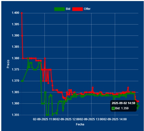 📌📉15,00 Hs Cierre del Dólar Divisa: Bid 1359,00 Offer 1361,00 cotización entre Bancos. Con USD 545 millones de Divisa, volumen records. Termina bajando sobre el final, marcando tendencia para mañana. Resta saber, cuanto vendió el Tesoro para alcanzar este volumen