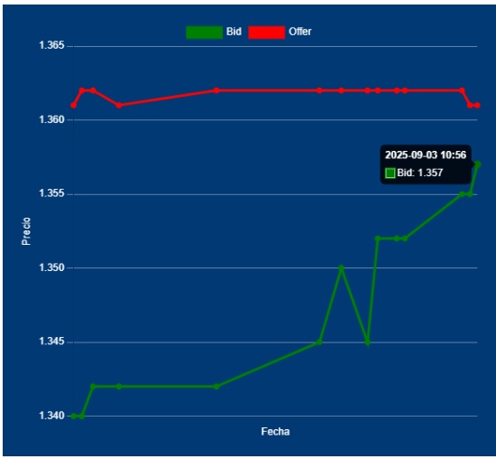 📌🔁12,30 Hs Cotización del Dólar Divisa: Bid 1361,00 Offer 1362,00 cotización entre Bancos. Off the records, sigue el Tesoro interviniendo. Ayer confirmaron que vendió USD 140 millones. Creo que esta cifra, va ir creciendo dado que es único vendedor genuino. Los AgroExportadores, están en liquidando, lo último de la cosecha 2025