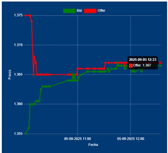 📌 📈14,00 Hs Cotización del Dólar Divisa: Bid 1367,00 Offer 1368,00 cotización entre Bancos. Sigue la presión compradora. El Tesoro, es el único que vende en el MULC