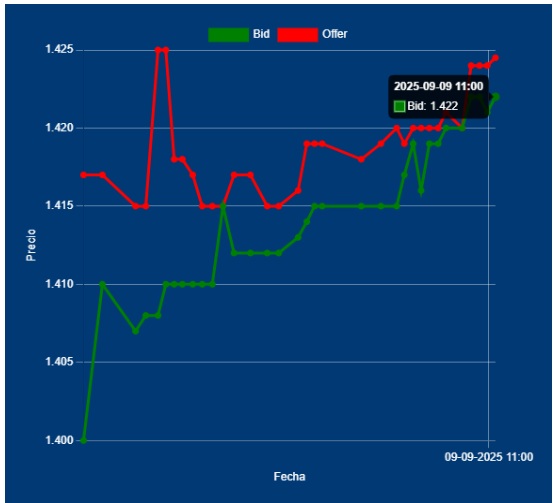 📌 📈11,00 Hs Apertura del Dólar Divisa: Bid 1422,00 Offer 1425,00 cotización entre Bancos. Son las primeras posturas en el MULC, muy poco operado y sin tendencia definida. No me extrañaría, que salga algo de EXPO que está retenida a medida que nos acerquemos a 1440,00 en el MULC