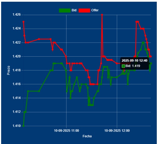 📌🔁12,40 Hs Cotización del Dólar Divisa: Bid 1419,00 Offer 1420,00 cotización entre Bancos. Continua, con una oscilación dentro de los rangos operativos similares al de ayer. La tendencia a la baja inicial, se borra y queda equilibrado entorno a 1420 en el MULC.