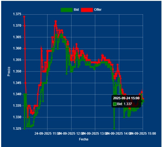 📌📉15,00 Hs Cierre del MULC – Dólar Divisa: Bid 1337,00 Offer 1338,00 cotización entre Bancos. Con USD 518 millones de volumen de Divisas (muy similar al del 19-SEPT fatídico), termina bajando $ 30,00 con respecto al cierre de ayer. Esto quiere decir, que hay más Importadores que se están animando a girar los Pagos retenidos, luego del susto de las semana pasada. En otros palabras, la baja pudo haber sido mayor, por el volumen operado. También hay que estar atentos, los rendimientos de Tasas Pasivas, dato que puede influir en la tendencia para los próximos días. Sugerencia: hagan sus proyecciones financieras, y tendrán un análisis preliminar sobre sus futuras operaciones en COMEX.