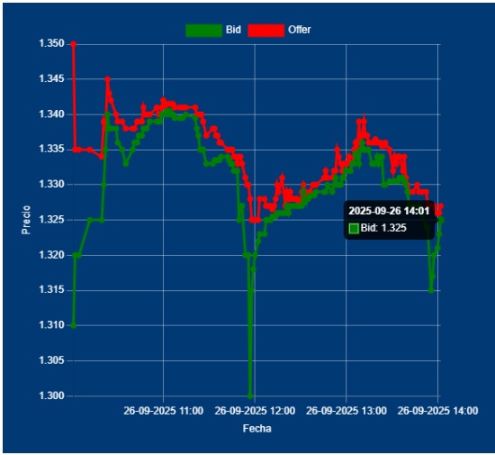 📌📉📈14,00 Hs Cotización del MULC – Dólar Divisa: Bid 1325,00 Offer 1327,00 cotización entre Bancos. Con mucho volumen y volatilidad, se opera en el MULC, dentro de una amplia franja de 1320 y 1340 Estimamos, USD 300 millones el volumen hasta ahora.