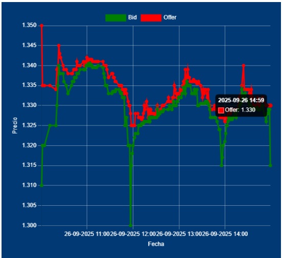 📌📉📈15,00 Hs Cierre del MULC – Dólar Divisa: Bid 1329,00 Offer 1330,00 cotización entre Bancos. Superó los USD 400 millones volumen de divisas, en el MULC. Una jornada atípica, máxime que no detectamos la incidencia de una parte de ese volumen de USD 7000 millones de los AgroExportadores. CIARA informó en redes sociales, que habrían liquidado el 50%