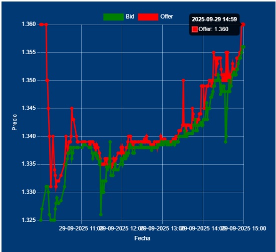 📌📈15,00 Hs Cierre del MULC – Dólar Divisa: Bid 1356,00 Offer 1360,00 cotización entre Bancos. Sube, $ 30,00 en la jornada. Donde las divisas de los AgroExportadores, deberían reflejarse en las reservas del BCRA. Nos confirmaron que semejante volumen, fue operado directamente al Tesoro, donde se notó la falta de oferta de divisa genuina en el MULC. La duda que hay, es: ¿que pasará a partir de mañana, sin el aporte de lo Cerealistas? Tengamos presente qué, aún estamos a $ 120,00 del techo de la banda superior. Y a $ 415,00 de la banda inferior del BCRA.