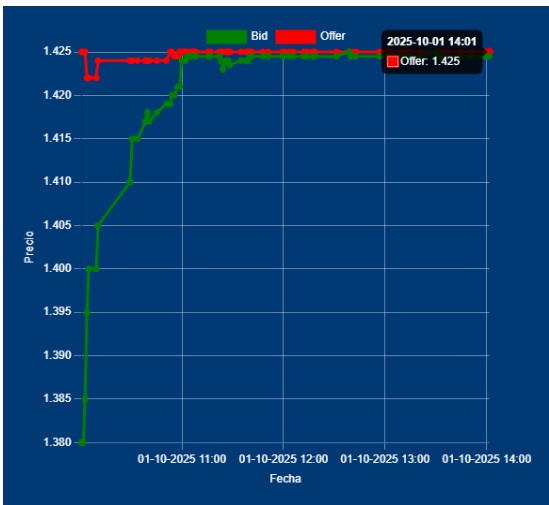 📌🔁12,30 Hs Cotización del MULC – Dólar Divisa: Bid 1424,00 Offer 1425,00 cotización entre Bancos. Es el Tesoro, es casi el único vendedor de Divisas, pero con una particularidad, muy bajo el volumen operado y escasos Importadores. Estamos a $ 55,00 de la banda superior.