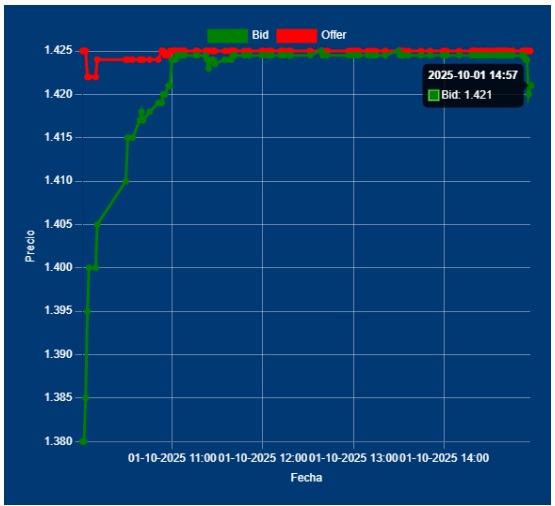 📌🔁15,00 Hs Cierre del MULC – Dólar Divisa: Bid 1421,00 Offer 1425,00 cotización entre Bancos. Toda la rueda, estuvo el Tesoro, como único vendedor de Divisas. Sobre le final, se operó con gran volumen. Riesgo País: 1230pb. Estamos a $ 55,00 de la banda superior. Hay que estar atentos, a posibles nuevas regulaciones cambiarias de parte del BCRA